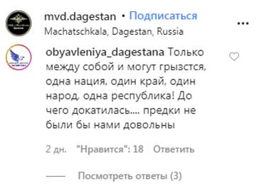 "Только между собой и могут грызться, одна нация, один край, один народ, одна республика! До чего докатилась", – написал пользователь obyavleniya_dagestana.
