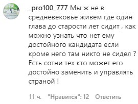 Часть пользователей Instagram выразила возмущение предложением Кадырова. "Мы же не в средневековье живём, где один глава до старости лет сидит. Как можно узнать, что нет ему достойного кандидата [на замену], если, кроме него, там никто не сидел? Есть сотни тех, кто может его достойно заменить и управлять страной!" - считает пользователь _pro100_777.