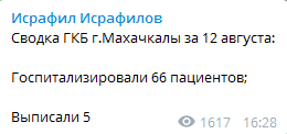 В больницу Махачкалы за 12 августа госпитализировали 66 пациентов с подозрением на COVID-19, выписали пять человек. сообщил в своем Telegram-канале пресс-секретарь медучреждения Исрафил Исрафилов. Это рекордное число поступивших в больницу с начала августа. Днем ранее в больницу было госпитализировано 59 пациентов с симптомами коронавируса, 10 августа - 43, привел он статистику.