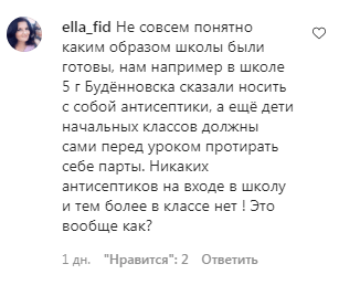 Пользователи также рассказали об отсутствии в школах средства дезинфекции. "Не совсем понятно, каким образом школы были готовы. Нам, например, в школе 5 города Будённовска сказали носить с собой антисептики, а ещё дети начальных классов должны сами перед уроком протирать себе парты. Никаких антисептиков на входе в школу и тем более в классе нет!" - написала