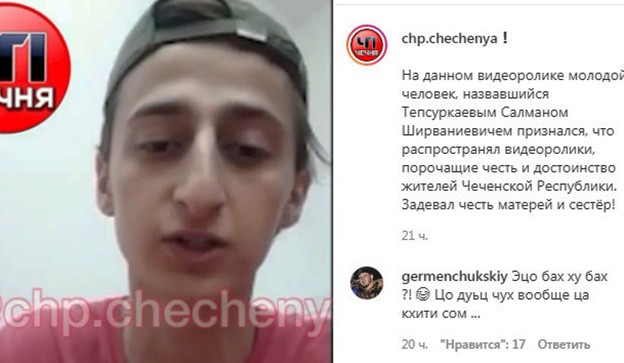 "В данном видеоролике молодой человек, назвавшийся Тепсуркаевым Салманом Ширваниевичем признался, что распространял видеоролики, порочащие честь и достоинство жителей Чеченской Республики. Задевал честь матерей и сестер!" – говорится в публикации видео в Instagram-паблике "ЧП Чечня". К 10.53 мск 9 сентября эта публикация, сделанная 8 сентября, собрала 71,3 тысячи просмотров и 1332 комментария. У паблика 148 тысяч подписчиков.