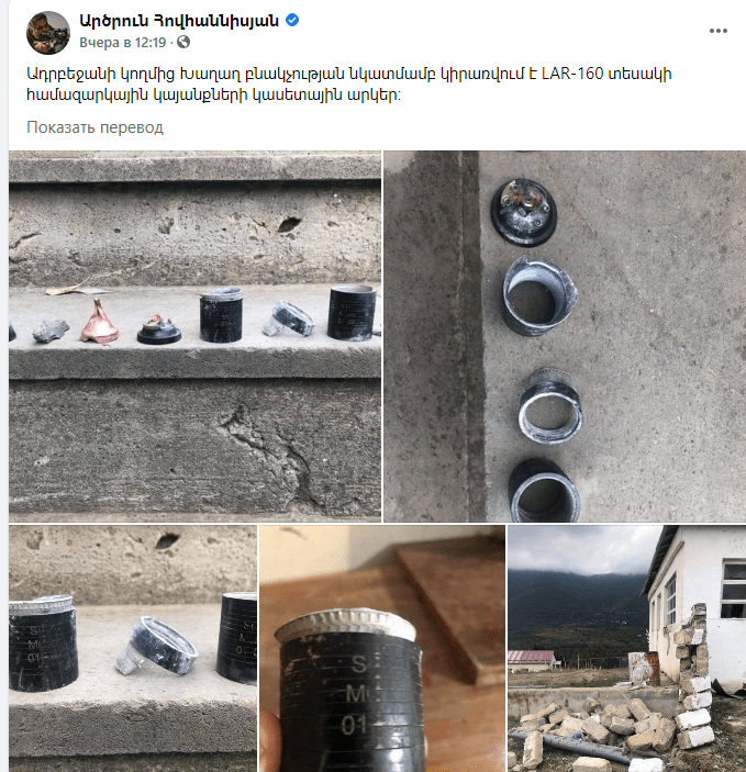 Ранее, 3 октября, официальный представитель Минобороны Армении Арцрун Ованнисян заявил, что Азербайджан применяет кассетные заряды залпового огня при обстрелах территории Нагорного Карабаха. "Азербайджан, в частности, обстреливает мирное население кассетными снарядами из установки залпового огня LAR-160", - перевел корреспондент "Кавказского узла" публикацию на странице Ованнисяна в Facebook.