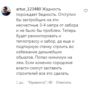 "Отступил бы застройщик на эти несчастные три-четыре метра от забора, и не было бы проблем. Теперь будет ремонтировать и теплотрассу, и забор, да еще и подпорную стенку строить во избежание дальнейших обвалов. Попал минимум на лям. Если, конечно, городские власти смогут заставить строителей все это сделать", -  отметил artur_123480.