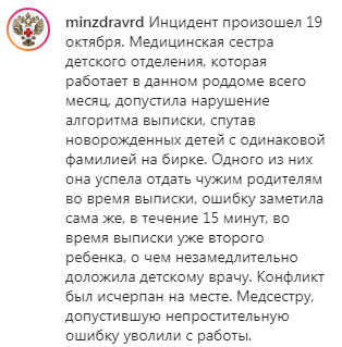 Медицинская сестра детского отделения "допустила нарушение алгоритма выписки, спутав новорожденных детей с одинаковой фамилией на бирке", - сообщил сегодня Минздрав Дагестана на своей странице в Instagram.