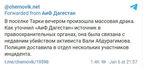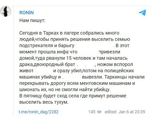 В поселке Тарки 6 января собрались люди, чтобы принять решение выселить семью предполагаемого распространителя наркотиков, сообщил анонимный Telegram-канал RONlN. В это время появилась информация, что его привезли домой, после чего "туда рванули 15 человек и там началась драка". Двоюродный брат предполагаемого распространителя наркотиков напал с ножом на одного из пришедших и нанес ранение, которое оказалось смертельным. После этого напавшего и предполагаемого распространителя наркотиков на полицейских машинах вывезли, а "таркинцы начали перекрывать дорогу всем [...] машинам и шмонать их, но не смогли найти убийцу", - говорится в сообщении.  На  8 января намечен сход села, "где примут решение выселить весь тухум (семейную общину. -  Прим. "Кавказского узла")".
