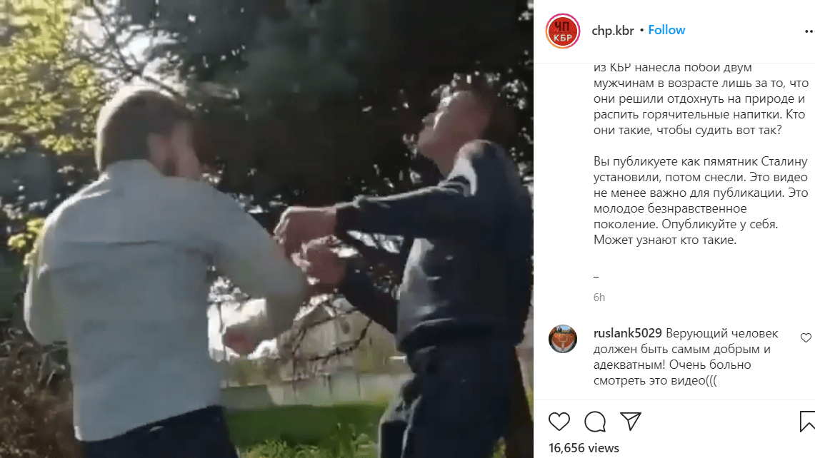 Instagram-паблик "ЧП.КБР" по просьбам пользователей соцсети опубликовал сегодня видео избиения. "Пара молодых людей из Кабардино-Балкарии нанесла побои двум мужчинам в возрасте лишь за то, что они решили отдохнуть на природе и распить горячительные напитки. Кто они такие, чтобы судить вот так?" - приводится в публикации сообщение пользователя, приславшего видео.