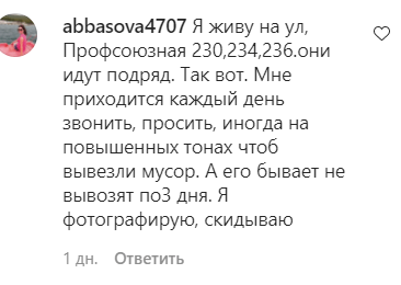 "Я живу на улице Профсоюзная 230,234,236 (в Нальчике).... Мне приходится каждый день звонить, просить, иногда на повышенных тонах чтоб вывезли мусор. А его бывает не вывозят по три дня. Я фотографирую, скидываю", - указала abbasova4707.