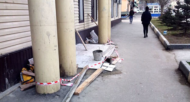 Строительные работы по установке пандуса продолжаются, передал корреспондент "Кавказского узла", побывавший сегодня утром у здания администрации. Ступенька у входа в здание расширена, а сбоку имеется плавный съезд с небольшим поворотом, так как по бокам у входа установленные массивные колонны. Конструкция еще не обложена плиткой.