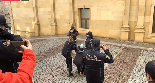 Супруга осужденного журналиста Полада Асланова вышла на пикет около здания Генпрокуратуры Азербайджана, требуя встречи с руководителем ведомства. Силовики оттеснили пикетчицу от входа в здание.