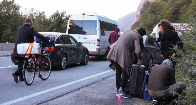 Людей без транспортных средств начали пропускать через границу с Грузией, после чего с российской стороны на пункте пропуска "Верхний Ларс" выстроилась огромная очередь из желающих перейти границу пешком, сообщил автор обнародованного 26 сентября в Telegram видео. Сотрудники полиции не пускают автомобили в сторону границы, и желающим выехать из России в Грузию приходится идти к пункту пропуска пешком или покупать велосипеды и скейтборды. Таксисты отказываются ехать к "Верхнему Ларсу" либо требуют за проезд слишком большие суммы, рассказали выезжающие.