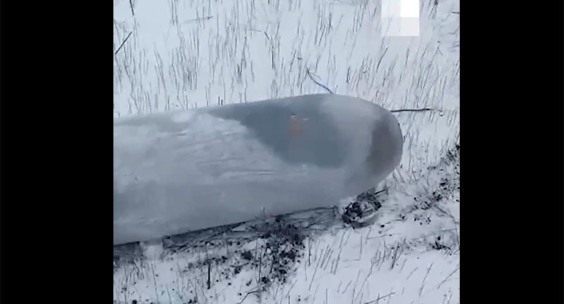 Далее оператор показал воронку в земле, а затем еще один продолговатый металлический предмет, напоминающий силуэт ракеты. На этом видео заканчивается.