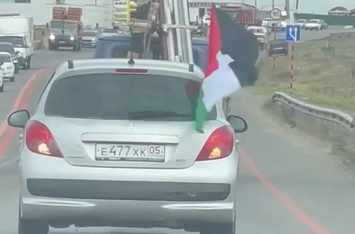 Еще одно видео с флагом Палестины опубликовала сегодня РГВК "Дагестан" в своем Telegram-канале. На видео, снятом из машины, виден автомобиль, который едет впереди, из окна автомобиля выставлен палестинский флаг. "Один из жителей республики решил по-своему поддержать Палестину. Машина с флагом была замечена на трассе в районе Хасавюрта", - говорится в описании к видео.
