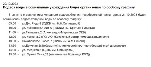 Администрации Астрахани опубликовала 20 октября график подвоза воды на 21 октября в медицинские учреждения на улицах Джона Рида, Кубанская, Татищева, Костина, Началовское шоссе, Еричная, Медиков, Сун-ят Сена.