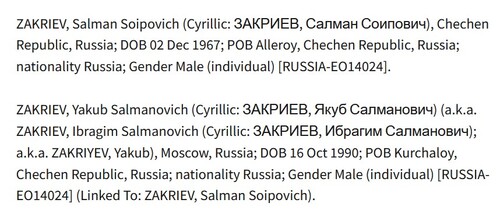Минфин США ввел санкции в отношении нескольких десятков российских компаний и граждан, в том числе первого зампредседателя парламента Чечни Салмана Закриева и его сына Якуба (Ибрагима), который возглавил национализированную компанию "Данон Россия". Салман и Якуб Закриевы приходятся соответственно зятем (мужем сестры) и племянником Рамзану Кадырову, сообщило 2 ноября "Кавказ.Реалии"*.