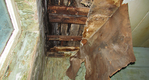 Жительница дома Татьяна Криулина показала состояние коридора на втором этаже. В одном месте на потолке видны обрушения перекрытия и штукатурки. Та же картина на общественной кухне. "Крыша как решето. Ходить по чердаку опасно. Можно провалиться. Во время дождей течи повсюду", - возмутилась Криулина, сказав, что крыша течет уже около 20 лет.