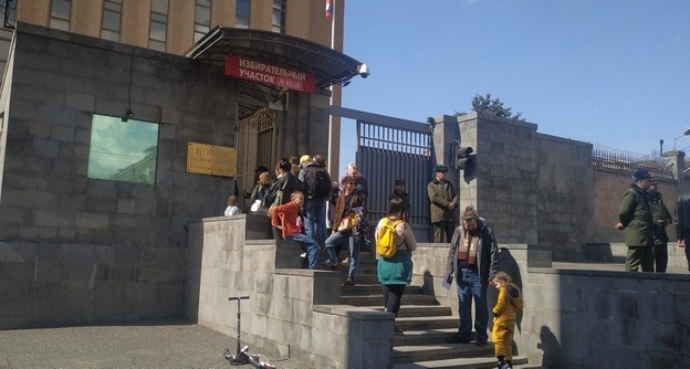 Сегодня перед зданием посольства, где расположен избирательный участок № 8026, выстроилась длинная очередь, которая доходит до здания мэрии Еревана. Длина очереди достигла 700-800 метров, сообщил корреспонденту "Кавказского узла" сотрудник полиции.