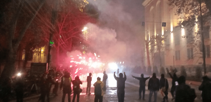 Протестующие у парламента Грузии бросают петарды в силовиков, спецназ стреляет по демонстрантам слезоточивым газом.