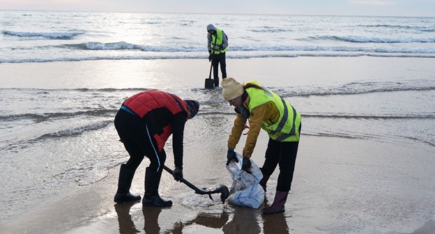 "Береговая полоса здесь узкая и безопасно работать можно лишь в условиях штиля. В уборке мазута задействовано более 120 человек, это сотрудники сельских администраций, муниципальных учреждений, хозяйствующих субъектов района, специальных служб, волонтеры", - указано в сообщении администрации.