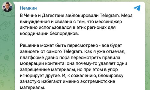 "В Чечне и Дагестане заблокировали Telegram. Мера вынужденная и связана с тем, что мессенджер активно использовался в этих регионах для координации беспорядков. Решение может быть пересмотрено - все будет зависеть от самого Telegram... Платформе давно пора пересмотреть правила модерации контента: она почему-то удаляет одни запрещенные материалы, но при этом в упор игнорирует другие. И, к сожалению, блокировки зачастую избегают именно экстремистские материалы", - написал депутат.