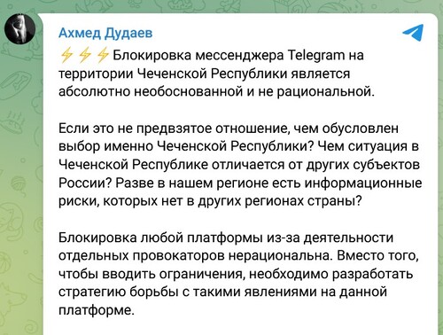 "Блокировка мессенджера Telegram на территории Чеченской Республики является абсолютно необоснованной и не рациональной. Если это не предвзятое отношение, чем обусловлен выбор именно Чеченской Республики? Чем ситуация в Чеченской Республике отличается от других субъектов России? Разве в нашем регионе есть информационные риски, которых нет в других регионах страны? Блокировка любой платформы из-за деятельности отдельных провокаторов нерациональна. Вместо того чтобы вводить ограничения, необходимо разработать стратегию борьбы с такими явлениями на данной платформе", - написал он.