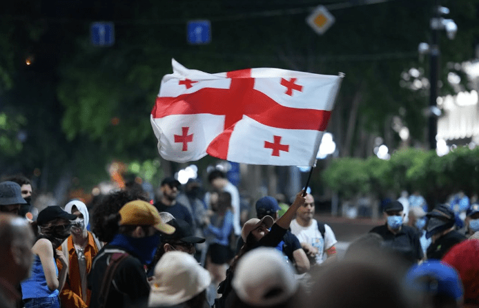 На приложенной к публикации фотографии участники акции держат в руках флаги Грузии, лица у части протестующих скрыты.