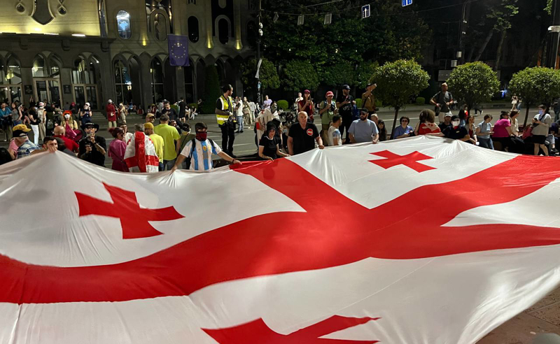 Сторонники евроинтеграции Грузии перекрыли проспект Руставели в 205-й день непрерывных протестов, развернув на нем огромный национальный флаг. Фонтан у парламента протестующие окрасили в красный цвет, напомнив властям о жестоких разгонах акции в "ночь Гаврилова" шесть лет назад.