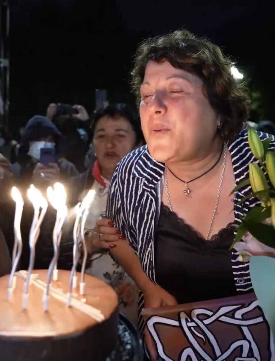 У здания парламента на проспекте Руставели активисты поздравили Нани с днем рождения песней и подарили ей торт со свечками, следует из видео Publika.