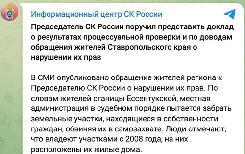 На обращение жителей отреагировал Следственный комитет. "Председатель СК России поручил представить доклад о результатах процессуальной проверки и по доводам обращения жителей Ставропольского края о нарушении их прав", - говорится в публикации, размещенной 17 июля в телеграм-канале информационного центра СКР.