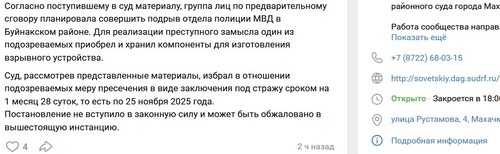 "Согласно поступившему в суд материалу, группа лиц по предварительному сговору планировала совершить подрыв отдела полиции МВД в Буйнакском районе. Для реализации преступного замысла один из подозреваемых приобрел и хранил компоненты для изготовления взрывного устройства", - говорится в публикации.
