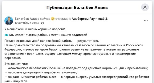 "После нескольких дней напряжённой работы — результат есть. Наше правительство по оперативным каналам связалось со своими коллегами в Российской Федерации, и вчера вечером было принято решение не применять новые миграционные ограничения к водителям, осуществляющим международные грузовые и пассажирские перевозки. Это значит, что: казахстанские перевозчики больше не попадают под действие нормы "90 дней пребывания"; массовые депортации и штрафы остановлены; сохранены тысячи рабочих мест - в первую очередь у малых автопредприятий, где работают наши водители", - написал он на своей странице в Facebook*.