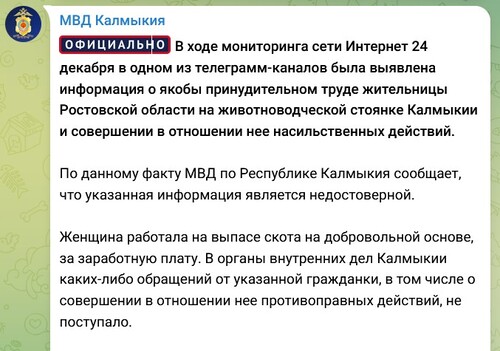 "В одном из телеграм-каналов была выявлена информация о якобы принудительном труде жительницы Ростовской области на животноводческой стоянке Калмыкии и совершении в отношении нее насильственных действий. По данному факту МВД по Республике Калмыкия сообщает, что указанная информация является недостоверной", - заявило ведомство.