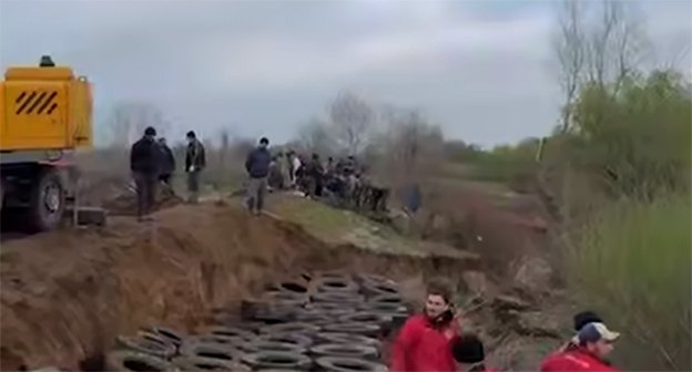 На видео сельчане укладывают на берегу покрышки и мешки с песком, фиксируя их сеткой. Покрышки носят вручную.