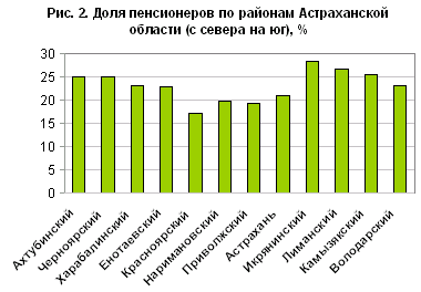 Рис. 2. Доля пенсионеров по районам Астраханской области (с севера на юг)