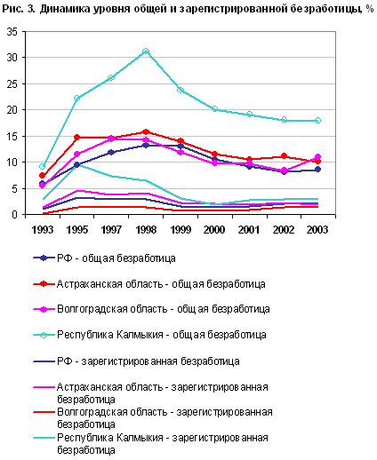 Динамика общей и зарегистрированной безработицы в области на протяжении переходного периода совпадала с общероссийским трендом (рис. 3). По сравнению с другими "русскими" регионами Юга с более диверсифицированной структурой экономики (Волгоградская область, Краснодарский и Ставропольский края) уровень общей безработицы в Астраханской области немного выше (11%), хотя и не сопоставим с показателями слаборазвитых регионах, например, соседней Калмыкии.