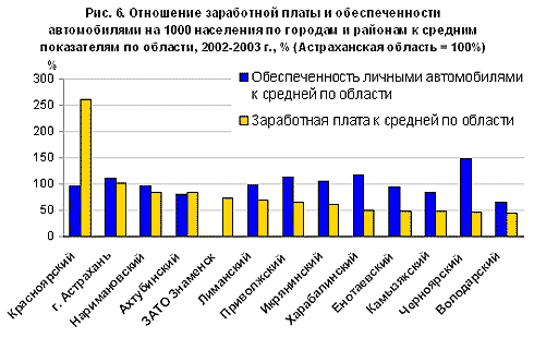 Рис. 6. Отношение заработной платы и обеспеченности автомобилями на 1000 населения по городам и районам к средним показателям по области, 2002—2003 г. (Астраханская область = 100%)