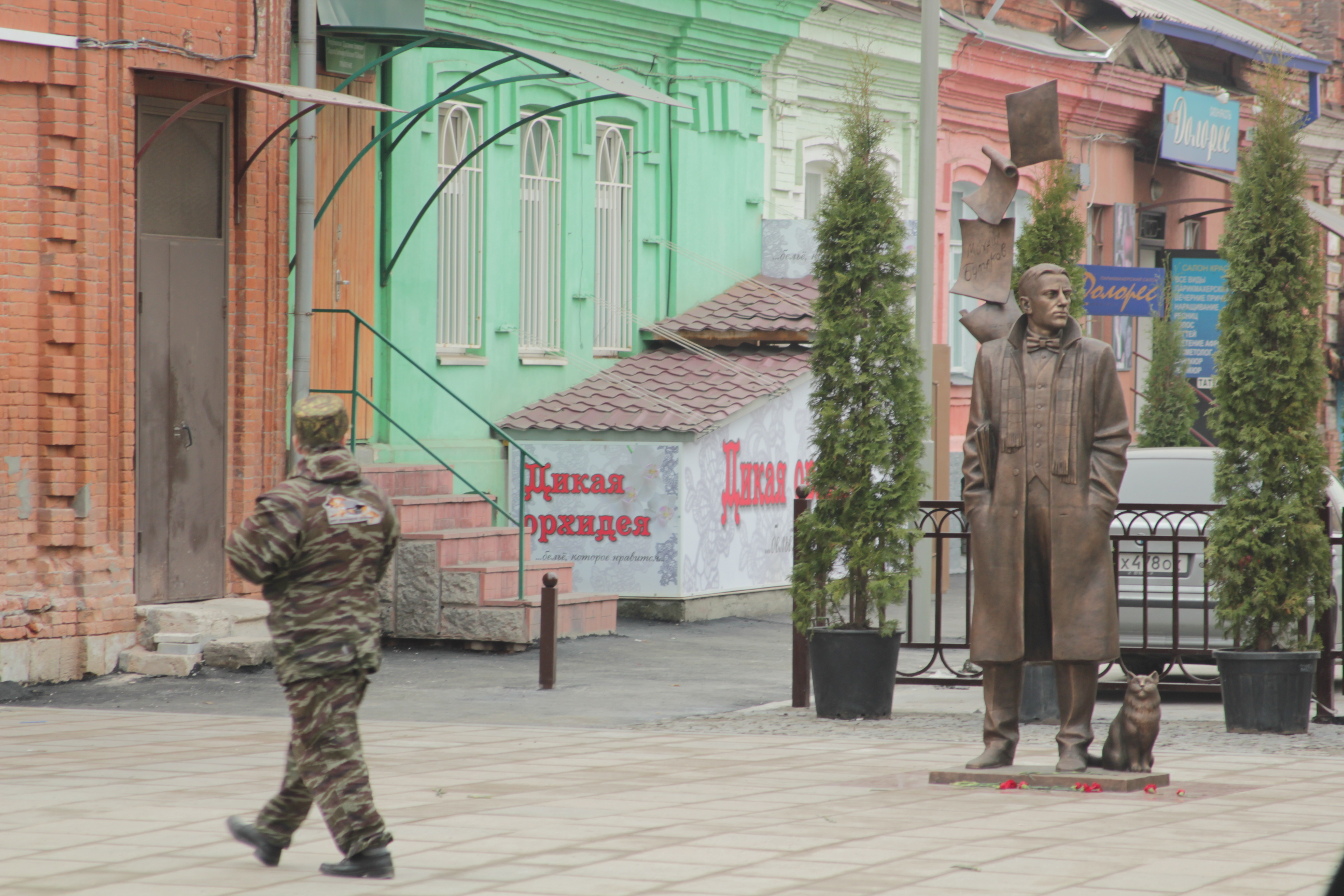 считаю ерундой все эти споры о том, стоило ли ставить памятнико человеку, который весьма нелестно отзывался о Владикавказе. насколько помню по воспоминаниям его жены, когда они приехали во Владик, город им очень даже нравился, везде кафе, музыка, нет голода как в Москве. это потом уже началась здесь гражданская война, и Булгаковы не бежали лишь потому, что писатель лежал с лихорадкой брюшного тифа. и конечно потом, при красных, ему здесь было не сладко. денег не платили, запихнули в маленькую комнату на той самой улице, где сейчас памятник, где у него даже не было письменного стола. в добавок, постоянно боялись расправы со стороны Красных и тд... конечно он хотел отсюда бежать.