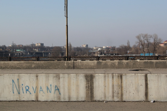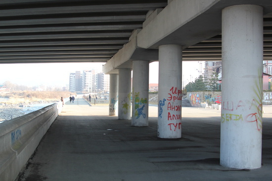 во Владикавказе есть т.н. "новый мост". его построили наверно лет 10 назад с расчетом снести ветхие дома в которые он упирается. но пока его строили, в эти дома под снос вписалось такое количество человек, что обеспечить каждого из них жильем оказалось не под силу. и мост много лет так и стоял без дела. за это время его облюбовали маргиналы и босяки. за это время он покрылся различными надписями и граффити. потом наконец мост открыли, но только одну половину, разделив ее тоже на две полосы. так он и стоит, полумост. я пошел туда зимой, чтобы снять видео о жизни моста, о его характере, но было туманно и я сделал только фотографии.