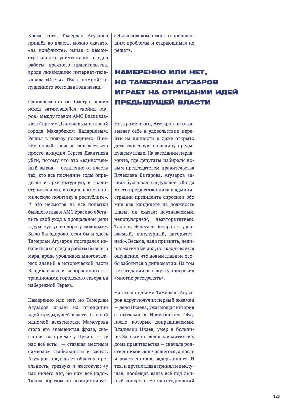 Кроме того, Тамерлан Агузаров пришёл во власть, можно сказать, «на конфликте», начав с демонстративного уничтожения следов работы прежнего правительства, вроде ликвидации интернет-телеканала «Осетия ТВ», с помпой запущенного всего два года назад.