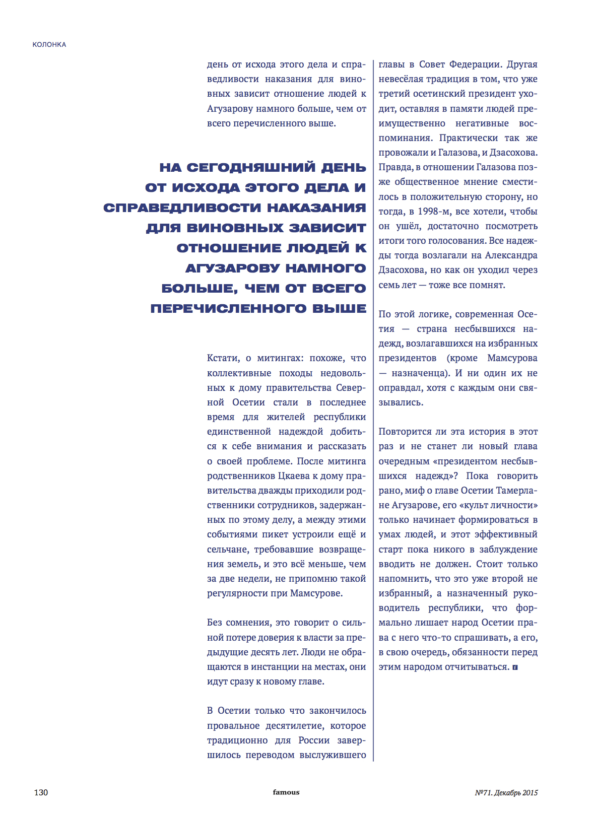 В Осетии только что закончилось провальное десятилетие, которое традиционно для России завершилось переводом выслужившего главы в Совет Федерации. Другая невесёлая традиция в том, что уже третий осетинский президент уходит, оставляя в памяти людей преимущественно негативные воспоминания. Практически так же провожали и Галазова, и Дзасохова. Правда, в отношении Галазова позже общественное мнение сместилось в положительную сторону, но тогда, в 1998-м, все хотели, чтобы он ушёл, достаточно посмотреть итоги того голосования. Все надежды тогда возлагали на Александра Дзасохова, но как он уходил через семь лет — тоже все помнят.
