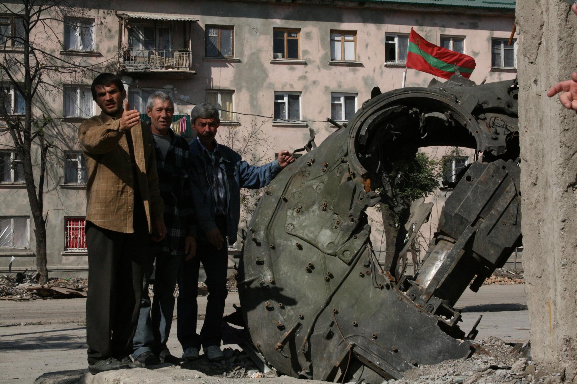 приднестровские рабочие у башни подбитого грузинского танка