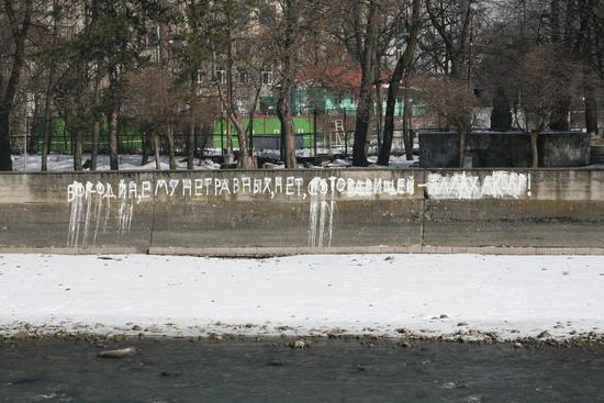 я уже встречал похожие надписи в центре Владикавказа, но эта просто заставила посмеяться. если кому трудно разобрать, то надпись на фото гласит: "БОГ ОДИН, ЕМУ НЕТ РАВНЫХ, НЕТ, СОТОВАРИЩЕЙ - АЛЛАХ АКБАР!" судя по содержанию надписи, писали какие-нибудь "малолетки", у которых не хватает даже приблизительного представления о содержании слов, которые они рисуют.