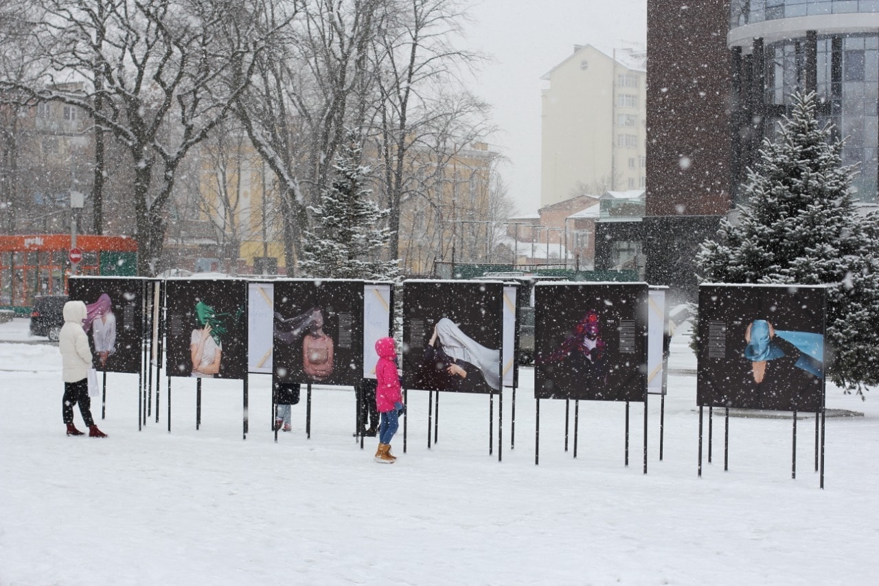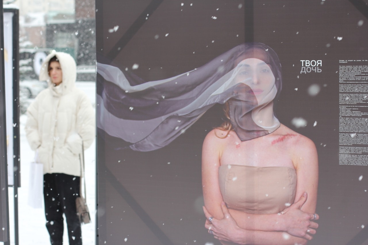 на фотографиях лица женщин закрыты платками, но при этом, это люди реально пострадавшие от домашнего насилия. то есть, так автор заставляет задуматься зрителя об этой проблеме. каждое фото сопровождает история героини. это очень трагичные истории. отдельно стоит стенд, где люди пишут свое мнение об этой выставке, о проблеме вообще.