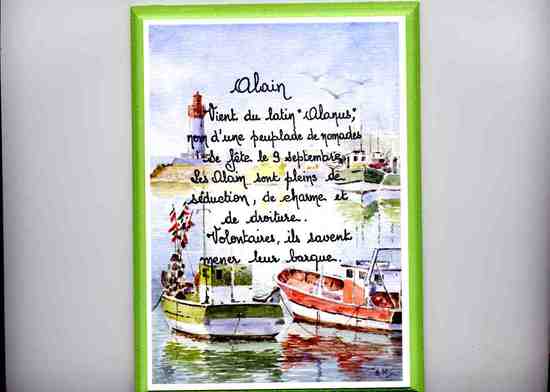 приятель мой живет в Париже. поехал на выходные в Бретань, на юге страны, и в сувенирной лавке там встретил вот этот экспонат - история имени "Ален". ну и прислал мне, в качестве подарка. верхние строчки переводятся как