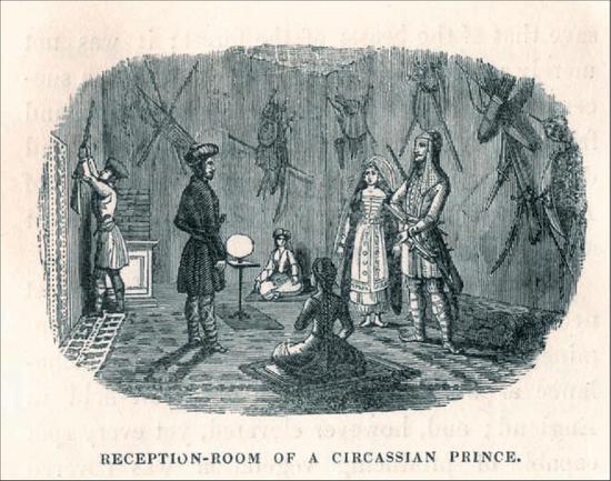 Иллюстрация из книги Э. Спенсера. Гостиная в доме черкесского князя. 1838.