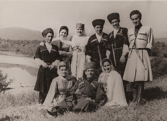 Шали оставались актуальны и в 1960-70-е гг. В центре фото - Кураца Каширгова, знаменитая гармонистка и хореограф Кабардино-Балкарии. Фото публикуется впервые.