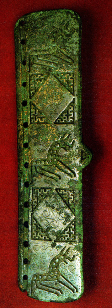 Поясные пряжки с изображениями оленя и собаки, с инкрустацией железом. Длина 17,2 см. Первая половина I тысячелетия до н. э. Кобанский могильник (Северная Осетия).