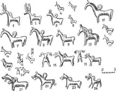 Бронзовые статуэтки домашних и диких животных из Тлийского могильника (Южная Осетия). 1—6 — олень; 7—13 — лошадь; 14 — бык; 15 — корова; 16, 17, 20 — козел; 18—19 — баран; 21—24 — собака