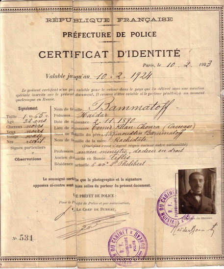 Удостоверение личности Г.Баммата, выданное префектурой в Париже в 1923 г.