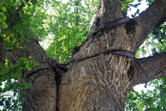 После удара молнии дерево стянули цепями, чтобы оно не развалилось.