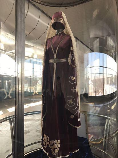 Что представлено на выставке? Это работы современных мастеров. В огромных стильных круглых стеклянных витринах – колбах выставлены и черкески, и женские платья с ручной вышивкой, и знаменитые черкесские столики анэ, и детские люльки, и свадебные знамена из орехов и многое другое.